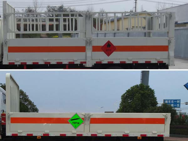 上装部分:厢体采用Q235碳钢瓦楞板,栏板高度500MM,带扩展可折卸加高栏板,厢体底部防滑花纹板。外观有危险品标识,其余标配,箱体颜色白色。