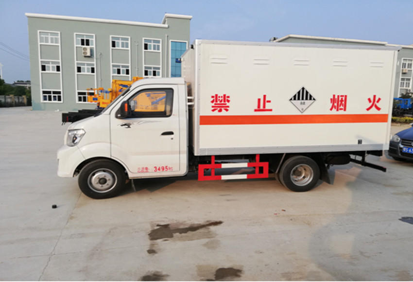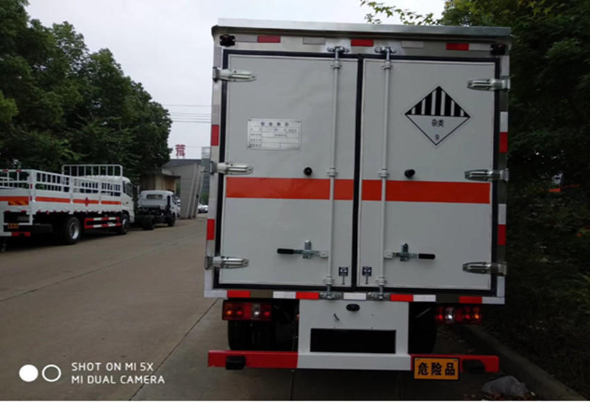上装部分:外形尺寸:5500*1850*2600mm,厢体内尺寸:3200*1700*1700mm,厢体采用外冷板,内饰铝板中间保温层制作,厢体底部和前部铺铺防静电胶皮,厢体安装固定货物卧环,安装气体泄漏报警器防盗报警器,带中开侧门,后双开门,带危险品顶灯,带两根拖地静电带,带危险品标示,带灭火器,其余标配。