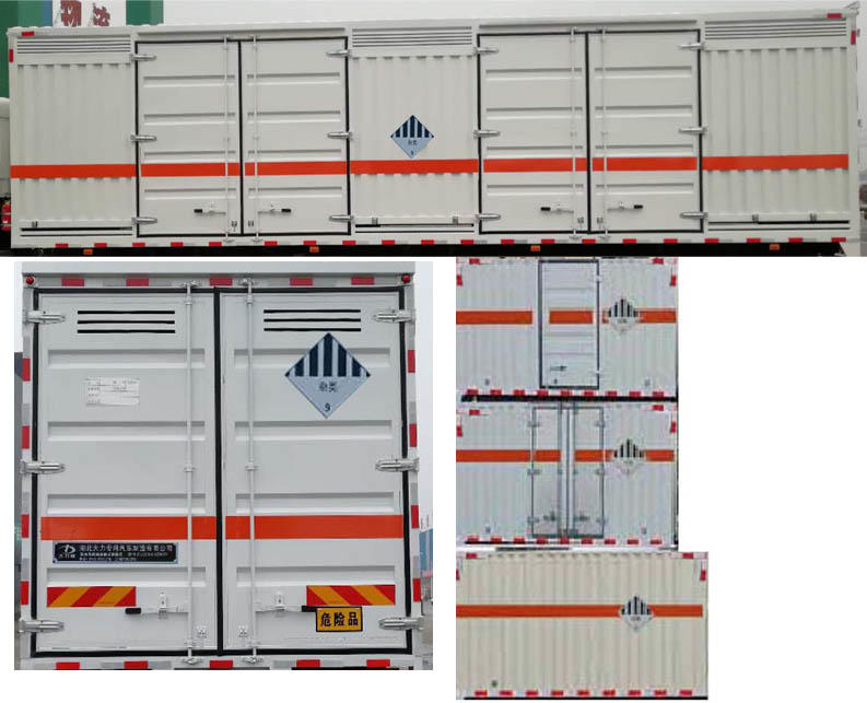 上装部分:外行尺寸119000*2550*3930MM,箱体内尺寸:9500*2400*2500MM。厢体采用厢体为双层金属骨架结构,外部为冷扎钢板,内壁采用铝合金板蒙面,夹层为隔热阻燃材料填充,侧壁设有防雨功能自然通风窗口,底部铺有阻燃导静电胶板外观有危险品标识,两侧设置灭火器固定支架,安装MFZ型手提式灭火器,防火熄灭器,危险品三角顶灯,反光标示,防静电拖带,9类杂项物品标示牌,其余标配。
