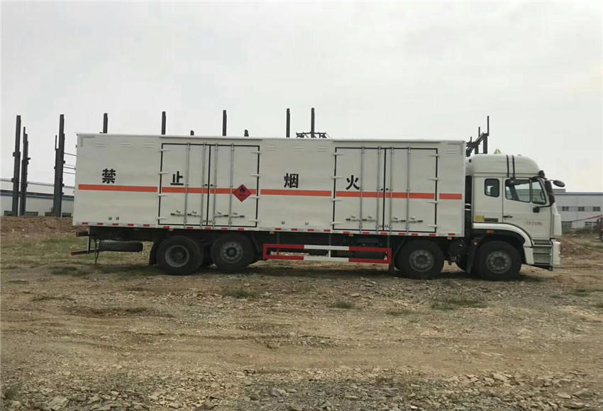 上装部分:外形尺寸11995*2550*3900MM,箱体内尺寸:9500*2400*2400MM。厢体采用厢体为双层金属骨架结构,外部为冷扎钢板,内壁采用铝合金板蒙面,夹层为隔热阻燃材料填充,侧壁设有防雨功能自然通风窗口,底部铺有阻燃导静电胶板外观有危险品标识,两侧设置灭火器固定支架,安装MFZ型手提式灭火器,防火熄灭器,危险品三角顶灯,反光标示,防静电拖带,3类易燃液体标示牌。其余标配,箱体颜色白色。