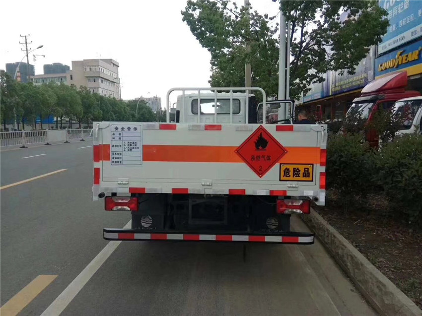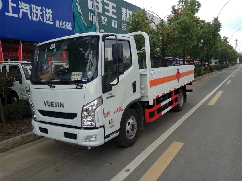 1.随底盘选装排半驾驶室,无栅栏货厢(附照片);2.用于运输具有独立罐(瓶)装:液化石油气,乙炔,乙烯,二氧化碳,压缩氩(氧,氮,氢,甲烷)等压缩气体,项号为:2.1,2.2;3.单排驾驶室对应车厢内长4155mm,排半驾驶室对应车厢内长3775mm;4.SOFIM8140.43DV发动机最大净功率是90kW,SC28R125Q5A发动机最大净功率是90kW;5.该车安装前轮盘式制动器,限速80km/h装置,辅助制动装置,排气管前置,子午线轮胎,装具有卫星定位功能的行驶记录仪;6,该车安装ABS;ABS系统控制器型号为APG3550500A6,VIE ABS-II,ABS系统控制器生产企业为浙江亚太机电股份有限公司,浙江万安科技股份有限公司.7.侧面及后下部防护装置材料为Q235,连接方式为螺栓连接,后部防护装置断面尺寸:100mm(断面高度)×50mm(断面宽度),离地高度为455mm.该车为危险品运输车,用于运输具有独立容器瓶包装的危化品,运送介质为:GB 12268-2012《危险货物品名表》中的液化石油气,丁烷,丙烷,打火机或打火机加油罐,压缩氧,溶解乙炔,类项号:2.1,2.1,2.1,2.1,2.2,2.1;8.可选装外观新标识及格栅造型
