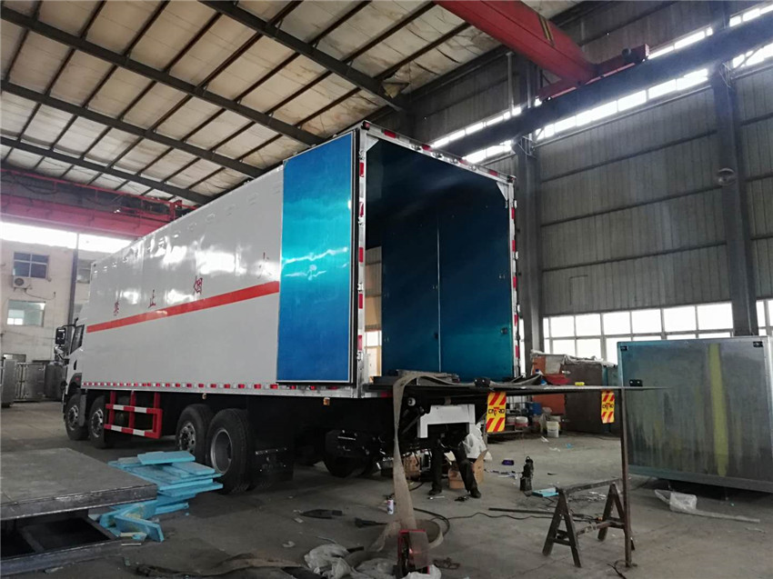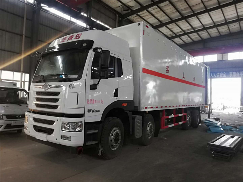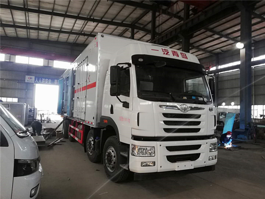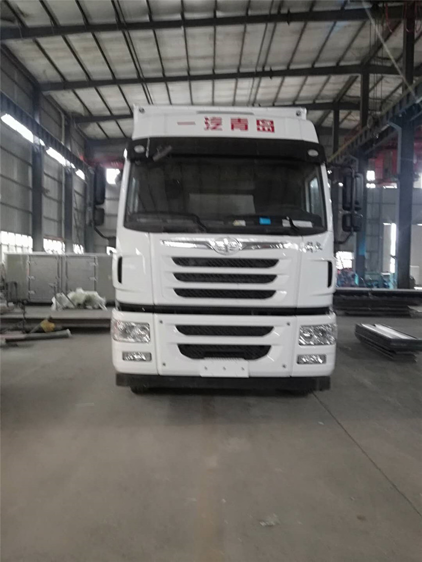 车厢顶部封闭,不可开启.选装平顶驾驶室.厢体选装平板板结构,厢体侧面选装开门型式及位置或不带侧开门,选装百叶窗,选装后部双拉杆结构.车厢选装可升降液压尾板.尾板收起状态的水平长度290mm.侧防护及后下部防护装置的材质为SS400钢,连接方式为螺栓连接,后部防护离地高度500mm,断面尺寸为130×85mm.安装具有卫星定位功能的行驶记录仪.ABS生产厂家/型号:万安科技上海万捷汽车控制系统有限公司/VIE ABS-II.油耗值37.3对应发动机CA6DL1-26E5,CA6DL1-29E5,油耗值39.3对应发动机CA6DK1-26E5.整车长度mm/货箱长度mm/轴距mm/后悬mm对应关系为:1.11995/9500/1900+4500+1350/2870;2.11040/8600/1900+4160+1350/2255.第三轴悬架型式为钢板弹簧和空气悬架复合式,不可提升.仅选装底盘选装排气管前置.选装前盘制动,限速装置,限速80km/h.仅选装11.00R20,12R22.5轮胎.该车为危险品运输车.该车运输具有独立容器(瓶)包装的:含铜废物,含镍废物,2008年国家环境保护部,国家发展和改革委员会令第1号发布的《国家危险废物名录》中危险废物,类项号:9,危险货物编号:HW22,HW46.