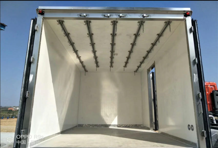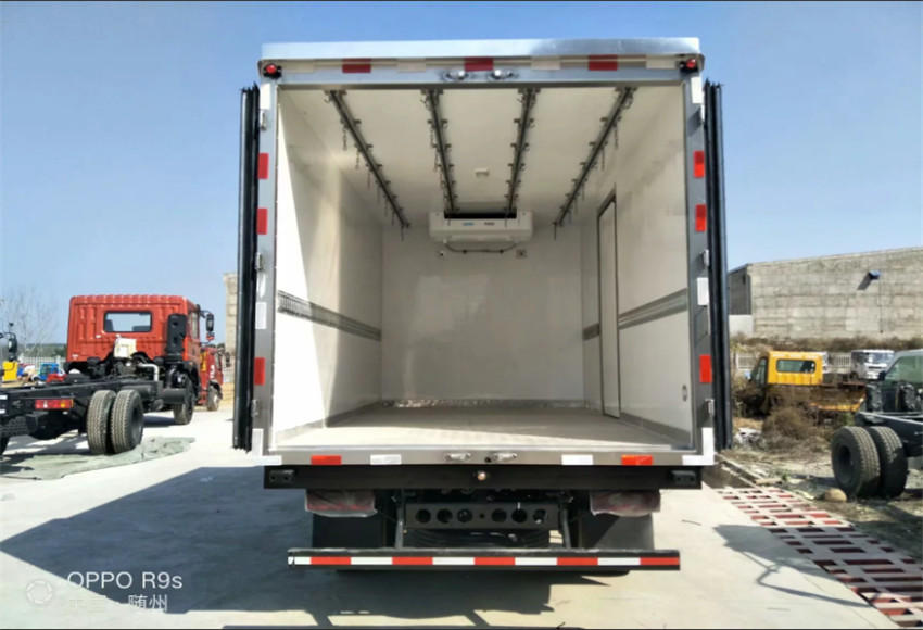 上装部分:整车尺寸:8995×2600×3850mm,厢体尺寸:6600×2450×2500mm,厢体采用内外玻璃钢、中间8CM 厚聚氨酯保温板、底板为防滑花纹铝板,不锈钢门锁件,-5度制冷机组,其余标配。(有燃油、有环保)