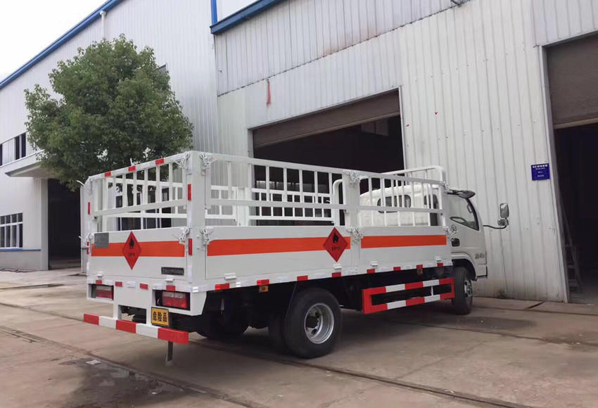 上装部分:整车长5995×2220×2420mm,内尺寸4100×2050×500mm,厢体采用Q235碳钢护栏板,栏板高度500MM,额载3965KG,带扩展可折卸加高栏板,厢体底部防滑花纹板。外观有危险品标识,其余标配,箱体颜色白色